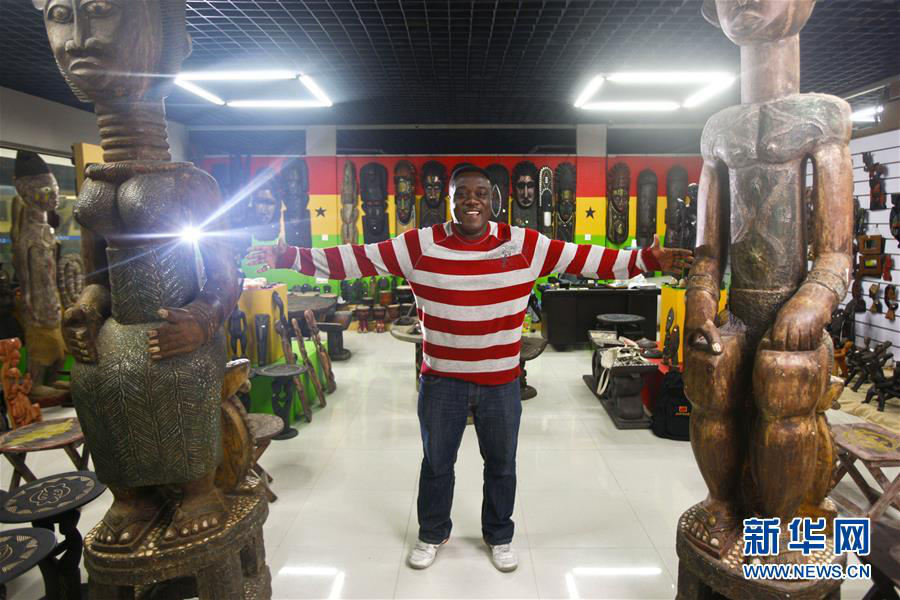 2013年3月20日,加納商人弗蘭克在浙江義烏國(guó)際商貿(mào)城自己的店鋪里留影。 新華社記者 崔新鈺 攝