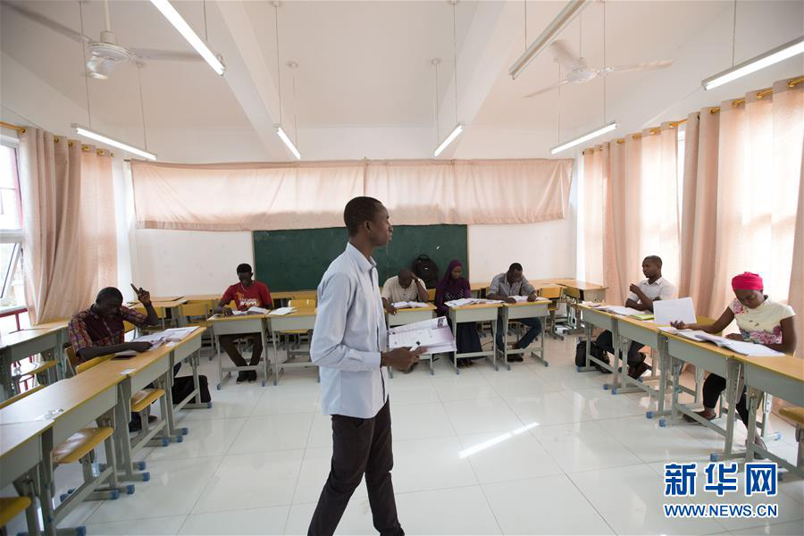 2018年7月18日,庫馬克·巴胡姆(中文名字巴虹)(前)在塞內(nèi)加爾達(dá)喀爾大學(xué)孔子學(xué)院教中文課。目前,達(dá)喀爾大學(xué)孔子學(xué)院已有3名在崗本土中文教師,他們以生動(dòng)、易懂的方式在塞內(nèi)加爾傳播中國(guó)文化,講述中國(guó)故事。 新華社記者呂帥攝