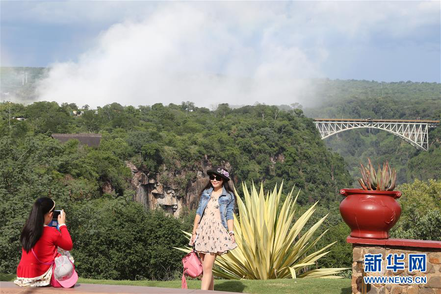 2017年1月27日,在津巴布韋維多利亞瀑布城,來自中國(guó)的一對(duì)母女以遠(yuǎn)處的贊比西鐵橋?yàn)楸尘芭恼樟裟?。近年來,春?jié)假期期間前往非洲旅游的中國(guó)游客逐漸增多。? 新華社發(fā)(費(fèi)列蒙攝)
