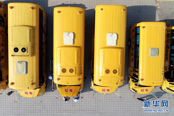 8月23日,河北省邢臺(tái)市公安交警支隊(duì)開發(fā)區(qū)大隊(duì)民警對(duì)轄區(qū)校車進(jìn)行安全檢查(無人機(jī)拍攝)。新華社發(fā)(陳雷 攝)