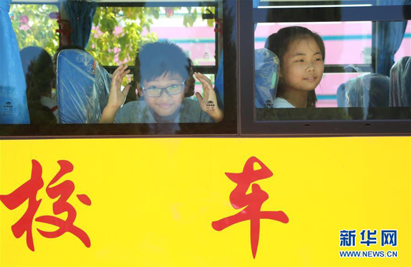 8月23日,興化市臨城中心校學(xué)生體驗(yàn)即將投入使用的新校車。新華社記者 李雨澤 攝
