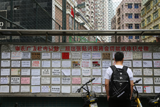 深圳市福田區(qū)崗廈村中的公告欄上貼滿了各種招租求租信息,一層層覆蓋著,圖為一位白領(lǐng)模樣的年輕人在看租房信息,崗廈村里像他這樣的白領(lǐng)還有很多,他們大都在附近的寫字樓里上班。這個位于深圳市中心的城中村房東靠房租可以月入10萬元,白領(lǐng)花千元只能租個床位。視覺中國供圖