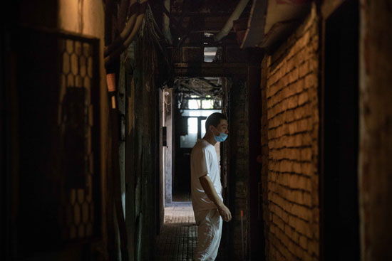 8月28日,天津市,來自山東的茂升在租住的居民樓道里乘涼。為了給妻子玉娟治療白血病,他們在與中國醫(yī)學(xué)科學(xué)院血液病醫(yī)院一墻之隔的海光新村租下一間臥室,房間悶熱潮濕,每月房費(fèi)1100元,電費(fèi)自理。這兩棟小樓里住著大約30戶居民,不少是跟他們一樣來津求醫(yī)的患者和家屬。視覺中國供圖