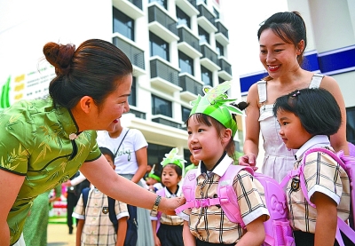 9月3日,在廣西南寧市逸夫小學(xué)賢賓校區(qū),老師在校門口迎接新同學(xué)。新華社記者 周華攝