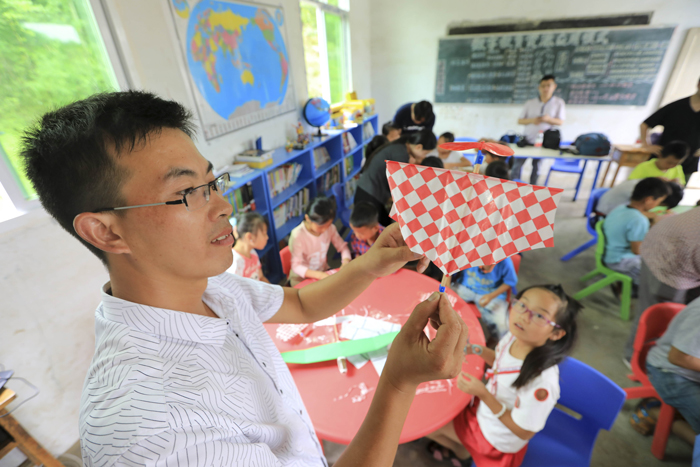 重慶彭水縣大壩村小學(xué)教師李大開在給學(xué)生們講解航空知識(shí) 劉潺/攝