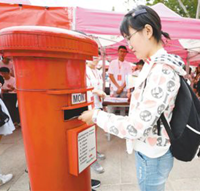 山東師范大學(xué)文學(xué)院新生將寫給自己的卡片寄到郵筒里,四年后,在他們畢業(yè)時(shí)將收到這張卡片留作紀(jì)念。人民視覺