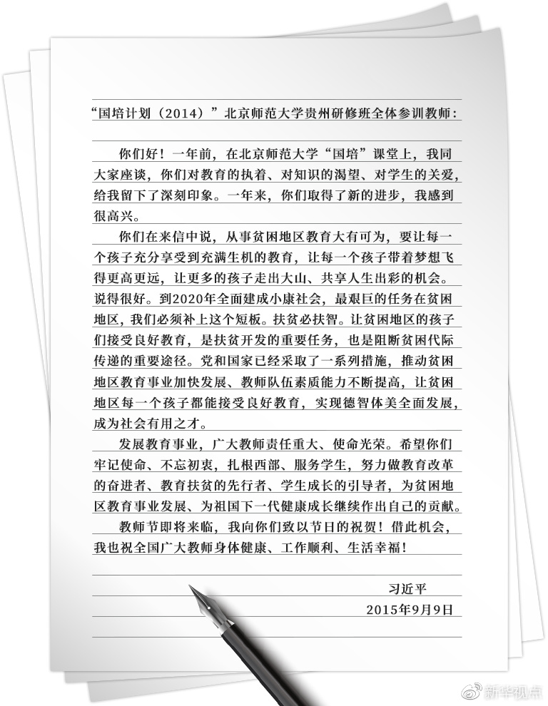 扶貧先扶智。在習近平總書記眼中,讓貧困地區(qū)的孩子們接受良好教育,是扶貧開發(fā)的重要任務,也是阻斷貧困代際傳遞的重要途徑。他在回信中勉勵這些扎根西部、對教育懷著無限執(zhí)著的年輕人,“努力做教育改革的奮進者、教育扶貧的先行者、學生成長的引導者”。