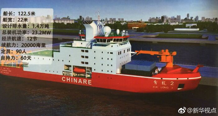 “雪龍2”號(hào)長(zhǎng)122.5米,寬22.3米,吃水7.85米,吃水排水量約13990噸,航速12節(jié)至15節(jié),續(xù)航力2萬海里,自持力60天,載員90人,能以2節(jié)至3節(jié)的航速在冰厚1.5米+0.2米雪的環(huán)境中連續(xù)破冰航行。