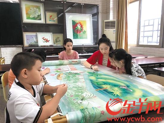 在廣州市荔灣少年宮,一群10歲左右的學(xué)生和一位20來歲的女孩正圍坐在一幅自然山水繡布前,女孩兩手時(shí)而靈活地穿針引線,時(shí)而放下針線,摸摸孩子們的小腦袋,抓起孩子們的小胖手,細(xì)心細(xì)語地說:“平常我們都用‘直紋直針’繡,如果要繡水紋,就要用‘稀疏針’了,直的地方保持平衡,波浪的地方就要打斜一點(diǎn)點(diǎn)……”
