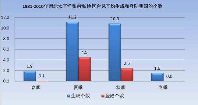 圖1 1981-2010年西北太平洋和南海臺(tái)風(fēng)平均生成和登陸我國個(gè)數(shù) 李慧 制圖