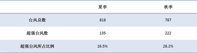 根據(jù)西北太平洋和南海生成臺(tái)風(fēng)的歷史資料,常年夏季生成的臺(tái)風(fēng)數(shù)量比秋季生成的臺(tái)風(fēng)要多,登陸我國的臺(tái)風(fēng)數(shù)量也比秋季多。七八月份生成臺(tái)風(fēng)的個(gè)數(shù)比九月以后生成的秋臺(tái)風(fēng)要多,但秋季更易出現(xiàn)超強(qiáng)臺(tái)風(fēng)。1949年至2017年,秋臺(tái)風(fēng)共生成787個(gè),其中超強(qiáng)臺(tái)風(fēng)有222個(gè),占比28.2%;這期間,夏季臺(tái)風(fēng)中超強(qiáng)臺(tái)風(fēng)的比例則為16.5%。