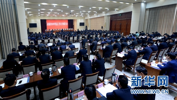 運(yùn)城市2018年重點(diǎn)工作公開承諾大會(huì)會(huì)場(chǎng)(4月10日攝)。新華社發(fā)