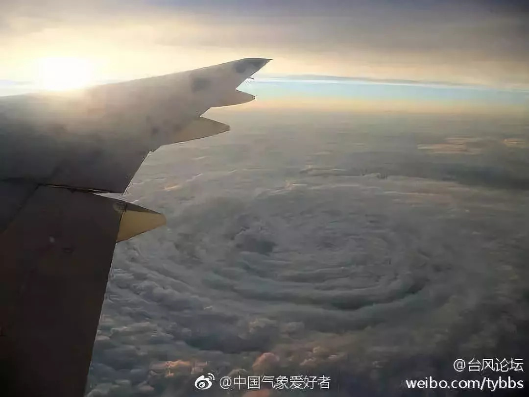 12日中午,網(wǎng)友@一個阿呆仔在微博上聲稱,“網(wǎng)友在飛機上拍到臺風山竹”,并配了一張飛機乘客視角拍攝的照片,圖中臺風山竹中心呈現(xiàn)出了一個水果山竹剝開后的樣子。