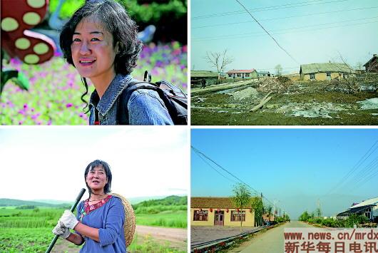 ▲左上圖為冷菊貞來(lái)小南河之前,是位漂亮的時(shí)尚女;左下圖為冷菊貞來(lái)小南河后干農(nóng)活,臉龐變得黝黑,成為一個(gè)“農(nóng)婦”(本報(bào)記者何山攝)。右上圖和右下圖為冷菊貞來(lái)小南河村前后村貌對(duì)比圖。(冷菊貞攝)
