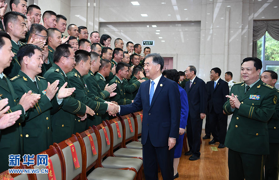 9月19日,中共中央政治局常委、全國(guó)政協(xié)主席、中央代表團(tuán)團(tuán)長(zhǎng)汪洋率代表團(tuán)部分成員分別赴寧夏軍區(qū)、武警寧夏總隊(duì)慰問,并會(huì)見自治區(qū)政法系統(tǒng)代表。這是汪洋慰問武警寧夏總隊(duì)官兵代表。 新華社記者 張領(lǐng) 攝