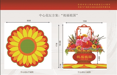 巨型花籃的北側(cè)是玻璃鋼制成的紅色籃體。今天凌晨,兩輛130噸吊車駛?cè)胩彀查T廣場,把花盤緩緩吊裝到籃體上。北京市花木有限公司相關(guān)負(fù)責(zé)人介紹,吊裝過程是有一定難度的,因?yàn)榛ūP體量大、分量重,要想平穩(wěn)、安全地吊裝到籃體上,需要精準(zhǔn)把握平衡?!罢G闆r下,要花費(fèi)一個(gè)小時(shí)左右才能完成?!钡跹b完成后,整個(gè)花壇頂高17米,花壇底部直徑50米。籃體南側(cè)書寫“祝福祖國,1949—2018”,籃體北側(cè)書寫“歡度國慶,1949—2018”。