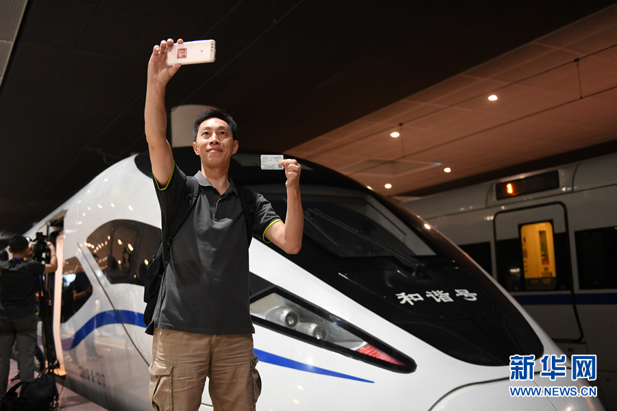 ??? 9月23日,搭乘G5711次高鐵列車前往香港西九龍站的乘客在深圳北站拍照留念。 當(dāng)日6時(shí)44分,G5711次高鐵列車從深圳北站開(kāi)往香港西九龍站,標(biāo)志著廣深港高鐵全線開(kāi)通,香港段正式投入運(yùn)營(yíng)。 新華社記者毛思倩攝