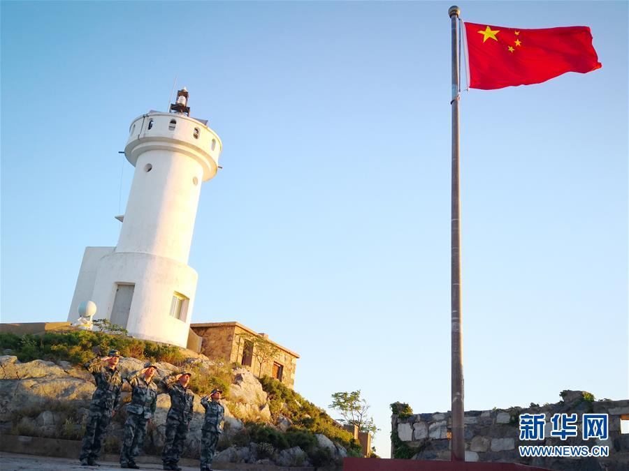 10月1日清晨,王仕花(右一)和守島民兵一起向國旗敬禮。 新華社記者 楊紹功 攝