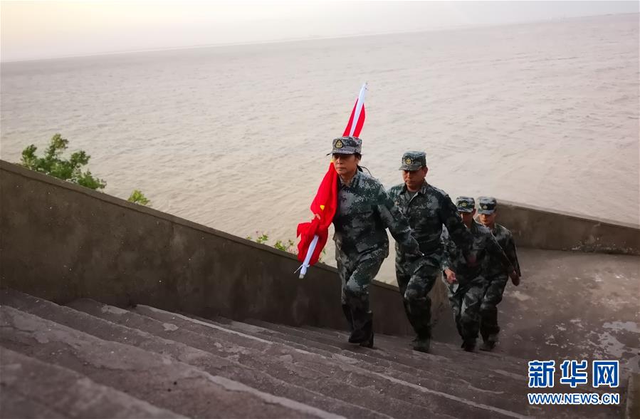 “1-2-1,1-2-1……”56歲的王仕花帶著3名守島民兵,迎著晨曦,肩扛國旗,向山頂?shù)纳炫_走去。