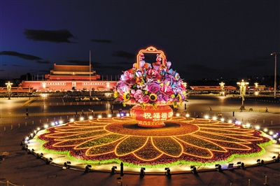 9月23日凌晨,天安門廣場高達17米的“祝福祖國”巨型花籃完工,正式與游客見面。除了天安門廣場,長安街沿線建國門至復(fù)興門的10處花壇,也為節(jié)日的北京增添喜慶。