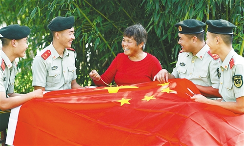 圖⑧ 9月29日,武警安徽總隊合肥支隊十七中隊邀請駐地“兵媽媽”張益蘭到軍營,與官兵一起繡國旗、唱國歌,迎國慶。徐偉 攝