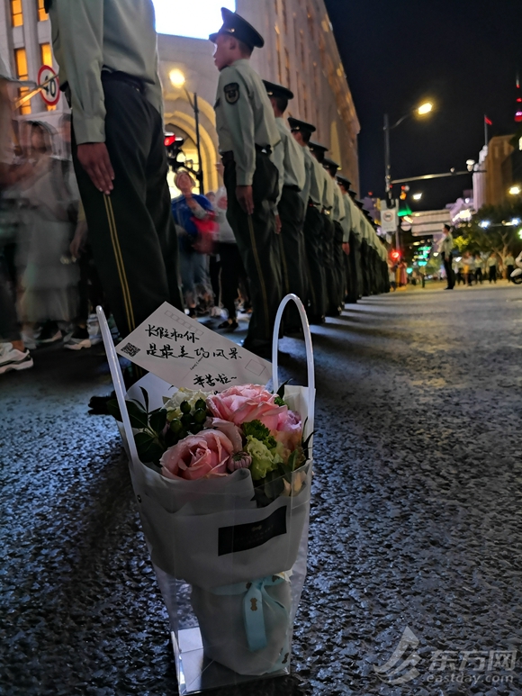 10月4日晚21時10分,在南京路步行街十字路口,一位姑娘手捧鮮花走執(zhí)勤官兵面前:“辛苦你們,這束花送給你們!”放下轉身便消失在人群之中。當執(zhí)勤官兵拿起鮮花時驚喜地發(fā)現(xiàn),里面還夾了一張?zhí)刂频拿餍牌?,娟秀的字跡寫到:“長假和你,是最美麗的風景。辛苦啦~比心~”