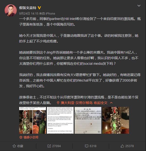 9月24日,知名旅游博主“假裝文森特”在微博發(fā)文稱,同事的伴侶凱特在澳大利亞的白天堂沙灘希爾灣撿到了一個來自印度洋的漂流瓶,瓶子里面有張紙條,是個中國船員寫的。信里道出了對未婚妻的無盡思念:“我是一名海員,現(xiàn)在正在印度洋上正在航行,心里很思念家中的未婚妻,剛訂婚不久我就出海了,心里感覺很對不起她,借著漂流瓶把心中的話寫出來。希望我回去以后,能跟晨靜和和美美,長長久久,其實呢,瓶子在深海中,也不奢侈有人能撿到打開,只是求一個心里的安慰?!币虼耍瑒P特非常希望能找到信中提到的未婚妻晨靜,告訴她她有一個多么棒的未婚夫。