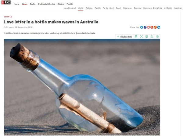 9月29日,新西蘭廣播電臺(RNZ)轉(zhuǎn)載了英國廣播公司的這篇報道,稱中國海員的這封情書已經(jīng)在澳大利亞引起轟動。