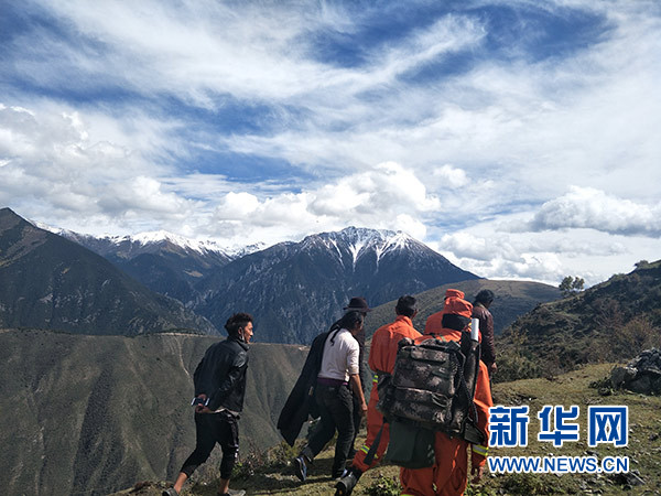 先遣隊(duì)員在波公村勘察地質(zhì)災(zāi)害情況(10月12日攝)。 新華社發(fā)(夏能 攝)