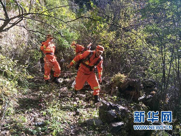 先遣隊(duì)員向山體滑坡核心區(qū)挺進(jìn)(10月11日攝)。 新華社發(fā)(夏能 攝)