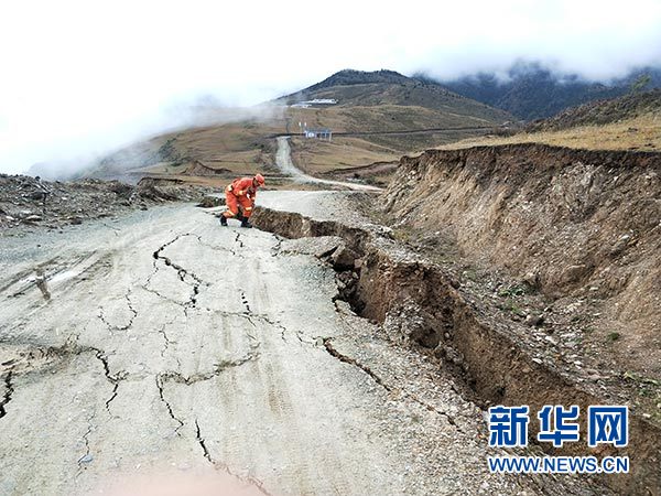 先遣隊(duì)員在波公村勘察地質(zhì)災(zāi)害情況(10月13日攝)。 新華社發(fā)(夏能 攝)