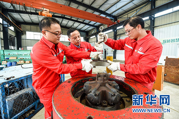 在中國(guó)石化江蘇油田工程技術(shù)服務(wù)中心,田明(中)與團(tuán)隊(duì)工作人員在保養(yǎng)設(shè)備(10月9日攝)。新華社記者 李博 攝