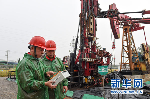 田明(左)與團(tuán)隊(duì)工作人員在江蘇真武油田井場(chǎng)現(xiàn)場(chǎng)調(diào)試設(shè)備(10月9日攝)。新華社記者 李博 攝