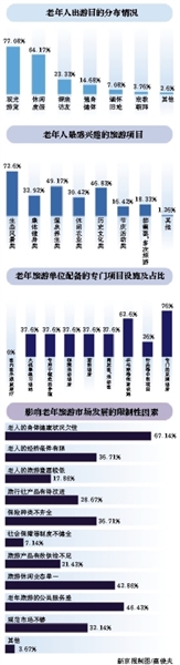 對(duì)于老年旅游市場(chǎng)發(fā)展的限制性因素,調(diào)查結(jié)果顯示前三位分別是:老人的身體健康狀況不佳;老年旅游的公共服務(wù)體系不夠完善,專(zhuān)業(yè)化、針對(duì)性的服務(wù)尤為不足;旅游休閑業(yè)態(tài)比較單一,與老年旅游需求的多元化、個(gè)性化不相匹配。
