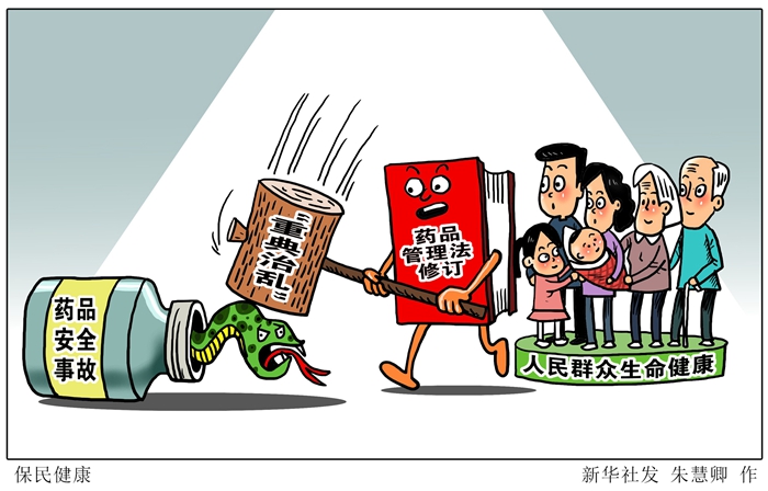 漫畫:保民健康 藥品管理法修正草案10月22日提請全國人大常委會審議,法律的修改為守住藥品安全底線、維護人民群眾生命健康,開出了去疴的“猛藥良方”。 新華社發(fā) 朱慧卿 作
