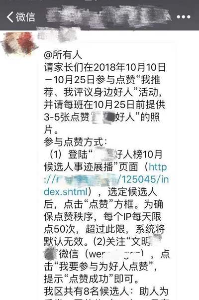 近日,廣東某所幼兒園的家長們又在群里收到老師發(fā)的通知:“請(qǐng)家長們?cè)?018年10月10日-10月25日參與點(diǎn)贊‘我推薦、我評(píng)議身邊好人’活動(dòng),并請(qǐng)每班在10月25日前提供3-5張點(diǎn)贊的照片?!?/p>