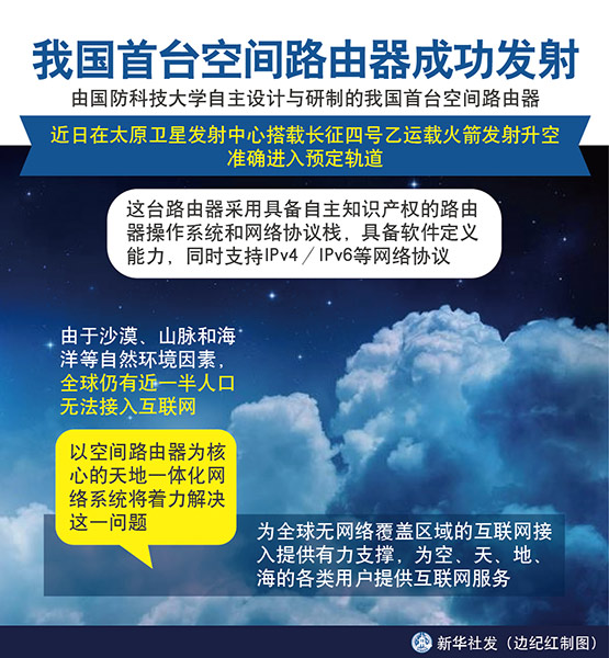 新華社長(zhǎng)沙10月29日電(趙寶康、劉于藍(lán))由國(guó)防科技大學(xué)自主設(shè)計(jì)與研制的我國(guó)首臺(tái)空間路由器,近日在太原衛(wèi)星發(fā)射中心搭載長(zhǎng)征四號(hào)乙運(yùn)載火箭發(fā)射升空,準(zhǔn)確進(jìn)入預(yù)定軌道。