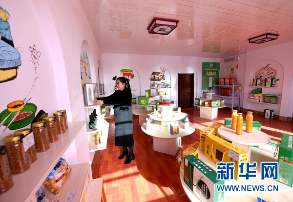 在山西省右玉縣殺虎口村,村民王彩霞在殺虎口村生態(tài)旅游專業(yè)合作社內整理當?shù)靥禺a(10月25日攝)。新華社記者 楊晨光攝