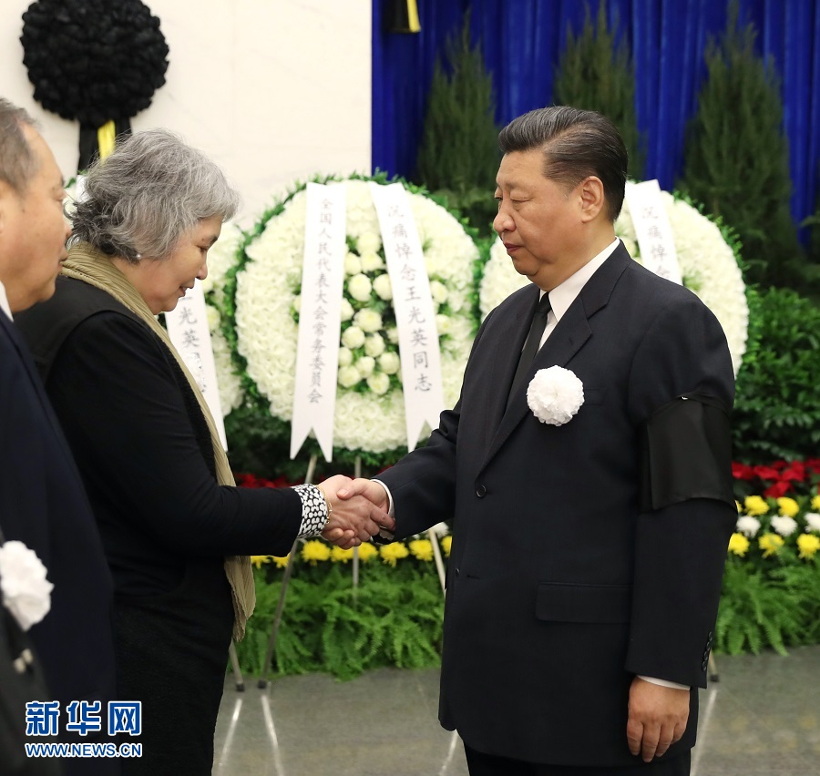 上午9時(shí)30分許,習(xí)近平、李克強(qiáng)、栗戰(zhàn)書(shū)、汪洋、王滬寧、趙樂(lè)際、韓正、王岐山、胡錦濤等,在哀樂(lè)聲中緩步來(lái)到王光英同志的遺體前肅立默哀,向王光英同志的遺體三鞠躬,并與王光英同志親屬一一握手,表示慰問(wèn)。