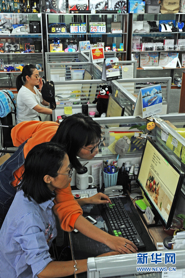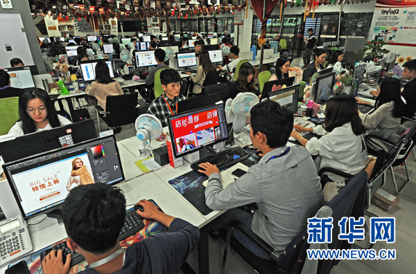 義烏市一家電商服務企業(yè)的員工在為電商平臺運營而忙碌(10月25日攝)。新華社記者 譚進 攝