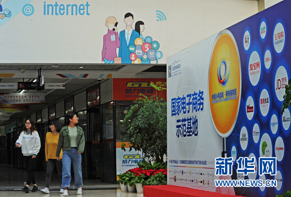 義烏電商企業(yè)的員工從國家電子商務示范基地的標識板旁走過(10月31日攝)。新華社記者 譚進 攝