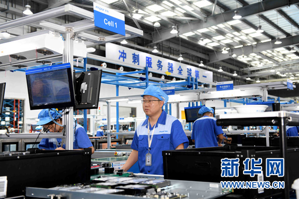 員工們?cè)诶顺备叨巳蒎e(cuò)計(jì)算機(jī)產(chǎn)業(yè)基地生產(chǎn)服務(wù)器(6月14日攝)。新華社記者 朱崢攝