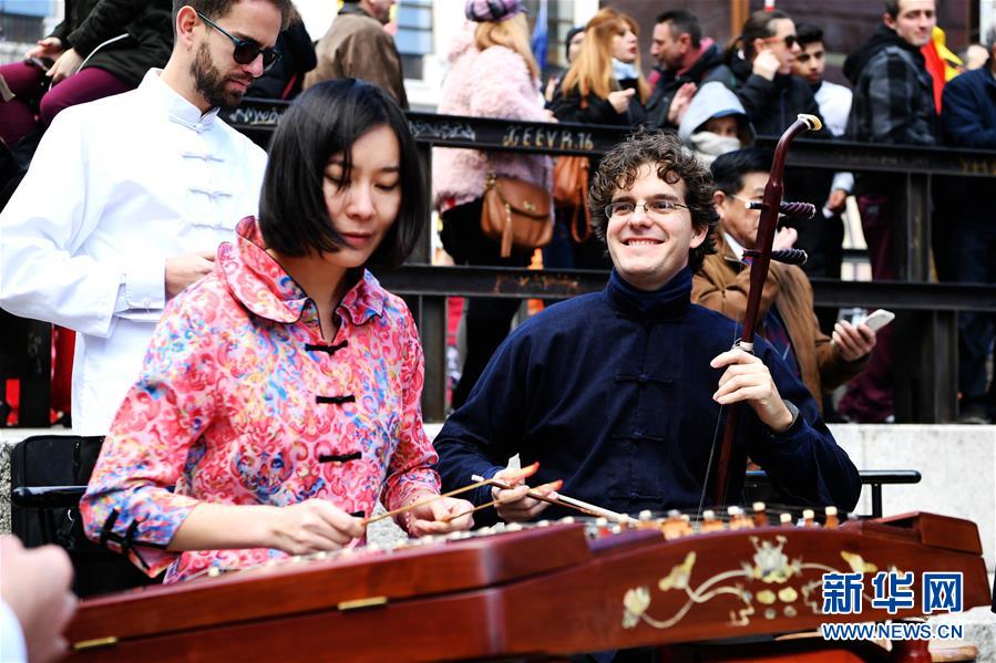 2018年2月11日,在西班牙馬德里,參加弘揚中國傳統(tǒng)文化的“快閃”藝術(shù)表演演員在索菲亞王后博物館前演奏民樂。新華社記者 郭求達 攝