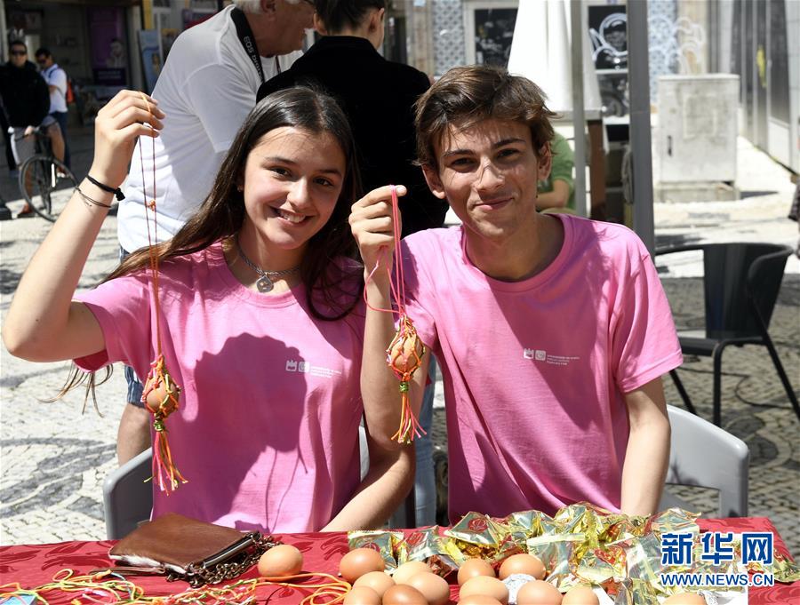 2018年6月16日,在葡萄牙阿威羅舉行的端午龍舟巡游活動開幕式上,阿威羅大學(xué)孔子學(xué)院的學(xué)生展示他們制作的蛋袋。新華社記者 張立云 攝