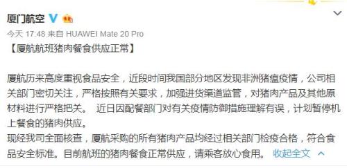 廈航稱,廈航歷來高度重視食品安全,近段時間中國部分地區(qū)發(fā)現非洲豬瘟疫情,公司相關部門密切關注,嚴格按照有關要求,加強進貨渠道監(jiān)管,對豬肉產品及其他原材料進行嚴格把關。近日,因配餐部門對有關疫情防御措施理解有誤,計劃暫停機上餐食的豬肉供應。