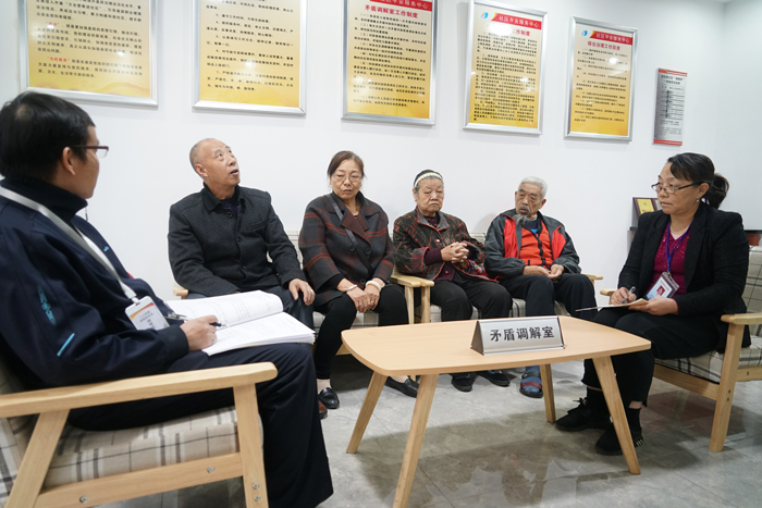 社區(qū)“順順吧”的街道干部、法院民警、駐點律師、街道民調(diào)員主動上門,通過多方調(diào)查了解,多次上門幫老人召開家庭會議,從法律、情理等多角度耐心勸說。馮婆婆一家最終達成協(xié)議,每位子女公平分配,且共同承擔老人的贍養(yǎng)義務,一家人重歸于好。
