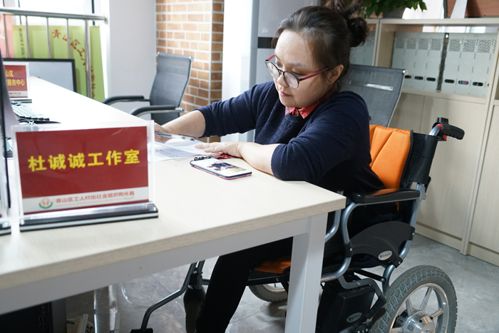 32歲的杜誠誠是一名社區(qū)殘疾人協(xié)理員,從小患有神經(jīng)纖維瘤,2009年左腿高位截肢。她沒有因此一蹶不振,而是通過讀書堅強意志,并萌發(fā)幫助殘疾人的想法。