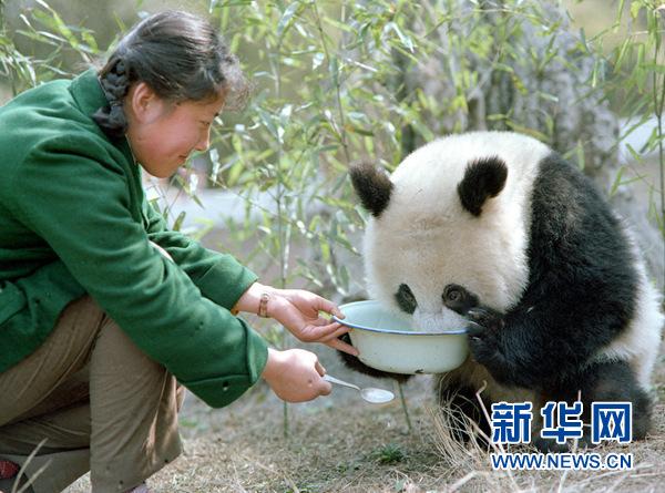 新華社記者金勖琪1980年拍攝的飼養(yǎng)員給即將送往德國(guó)的大熊貓“寶寶”喂牛奶。新華社記者 張超群 攝