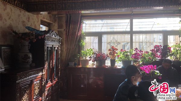 尕瑪文索的新家在統(tǒng)建區(qū)的一棟居民樓內(nèi),房間里擺滿了藏族特色的家具和裝飾品,各種花朵盆栽占據(jù)了整個(gè)陽(yáng)臺(tái)。“新房子的冬天和夏天一樣暖和,花可以繼續(xù)長(zhǎng),什么植物都可以養(yǎng)?!薄芭汀背闪随噩斘乃鲗?duì)新房子最大的印象。