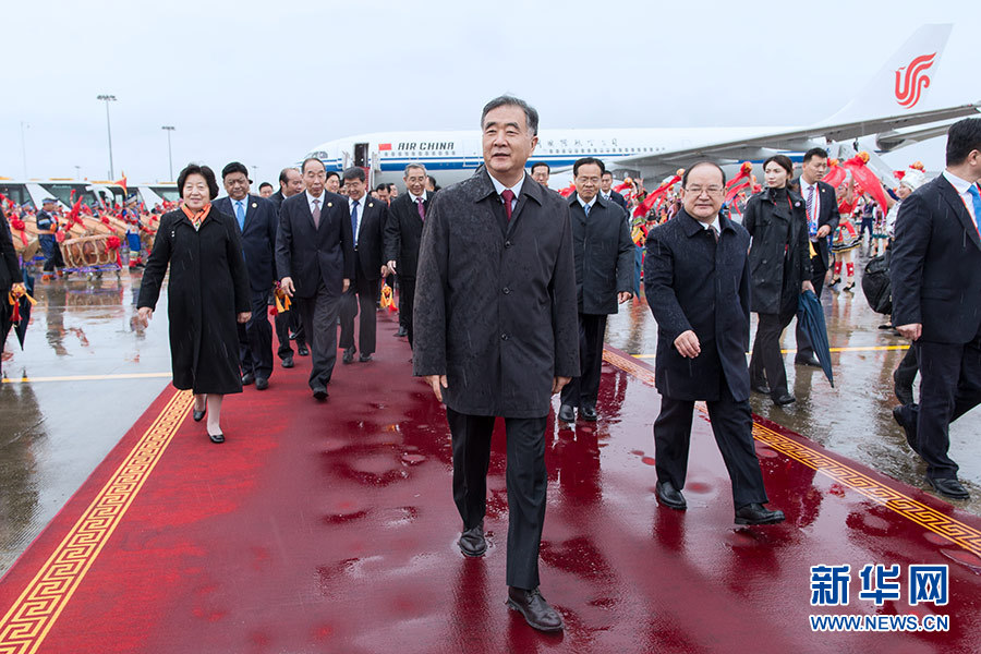 上午11時30分許,中央代表團乘坐的包機徐徐降落在停機坪上,等候在這里的500多人的歡迎隊伍爆發(fā)出熱烈掌聲和歡呼聲。汪洋走出飛機艙門,向歡迎群眾揮手致意。